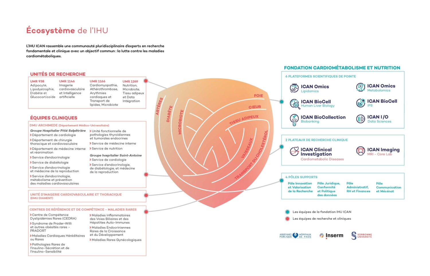 Créé en 2011, l’IHU ICAN (Fondation pour l’Innovation en Cardiométabolisme et Nutrition) constitue un pôle d’excellence dans le domaine des maladies du cardiométabolisme : diabète, obésité, maladies hépatiques (stéatose ou MASH), maladies du cœur et des vaisseaux.